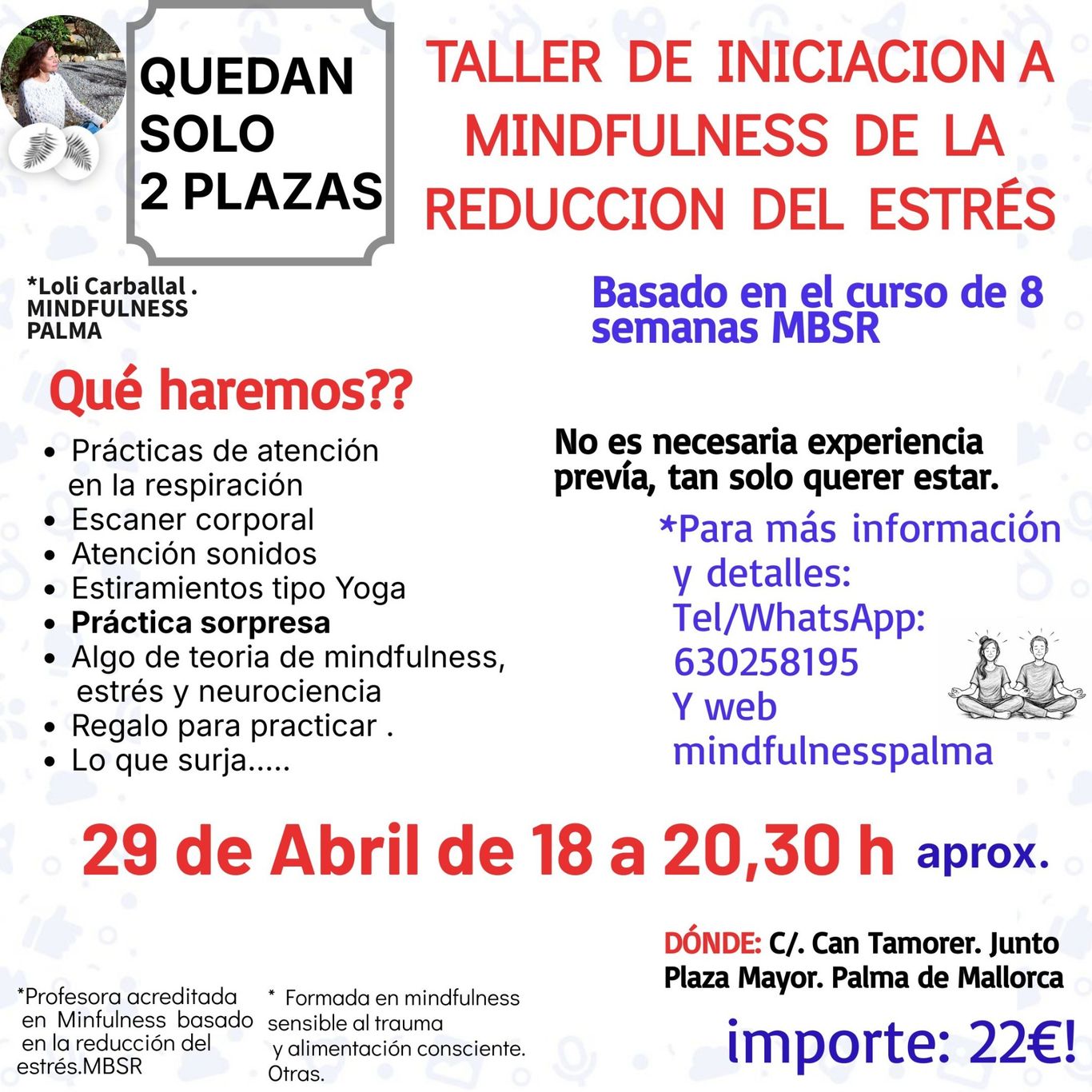 * Se trata del programa de 8 semanas de mindfulness basado en la reducción del estrés creado por Jon Kabat-Zinn en la Universidad de Massachusetts en 1979, creando la clínica de reducción del estrés y obteniéndose muy buenos resultados en aquellos pacientes que sufrían ansiedad, depresión, dolor crónico y tensión arterial alta. Su eficacia esta avalada científicamente. Es un programa experiencial, realizado en grupo, con ejercicios prácticos tales como la atención en la respiración, la atención en el cuerpo, en los sonidos, en pensamientos, emociones, así como diálogos que van surgiendo a raíz de las prácticas e indagaciones efectuadas en las clases, siempre desde un punto de vista práctico tanto en el ámbito personal como profesional, alternado con momentos de silencio. Se desarrolla durante 8 sesiones semanales de 2 horas a 2 horas y media más un día intensivo de practicas de 6 horas. Previo al inicio del curso hay una sesión de orientación de aproximadamente 2 horas o haber participado en una de mis clases-taller de iniciación. Y es conveniente un mínimo de práctica de 45 minutos al día (se facilitarán audios para ello) así como la asistencia a todas las clases semanales. Para ver el programa completo puedes ir al apartado de actividades.